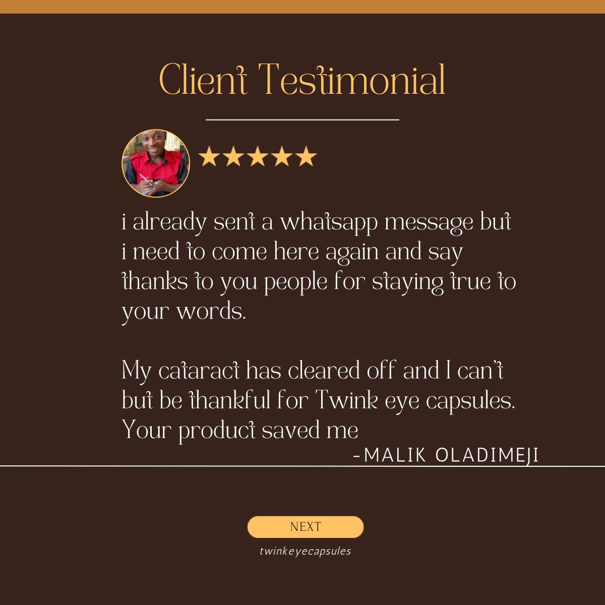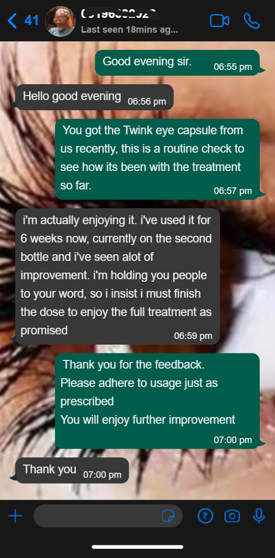 I can’t thank you enough! For years, my eyesight kept getting worse—reading was a struggle, and night driving was not possible. I almost lost my vision completely. But after using Twink Eye Capsules for a few weeks, my eyes felt a lot relieved, I could read better, and driving at night became much easier. Two months so far, my vision is clearer, and my life is better for it. Twink is truly a lifesaver!